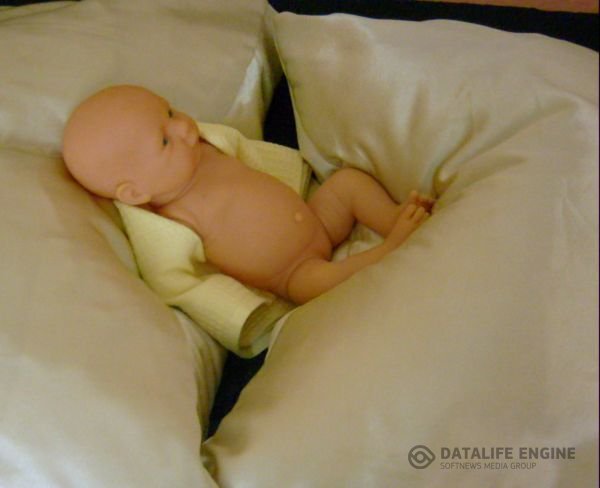 2. Теперь нужно уложить кроху между двух небольших подушек, таким образом, чтобы попа его была как бы в углублении, а голова приподнята. Фото 4, 5.